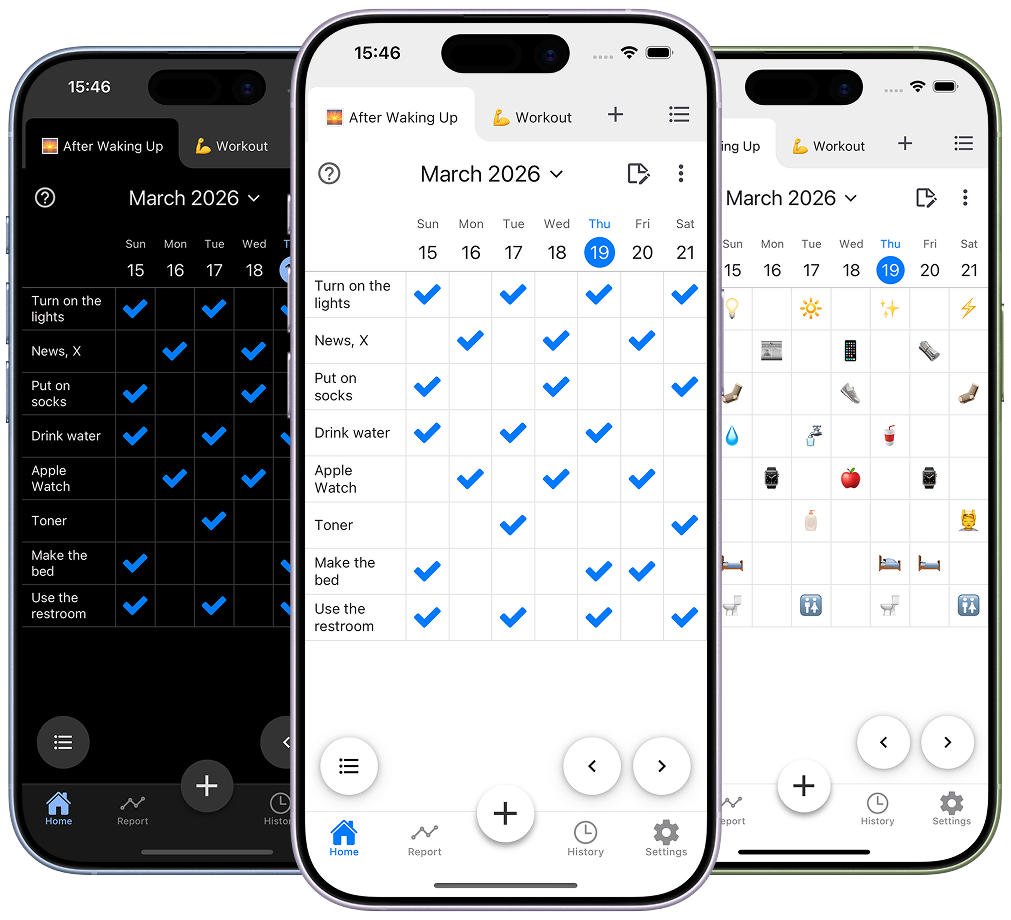I wanted to check off my habits and make them stick. That's how Habit Check Calendar was born. First, I wanted to track when I worked out—I kept forgetting. Then came drinking water. Since I had more than one habit to track, I made it work with unlimited tabs. After that, I wanted to check with my favorite emojis, add notes, and visualize with reports. Powerful features came together. Once you start recording your habits, I'm sure you'll feel it too—the sense that your life is changing.